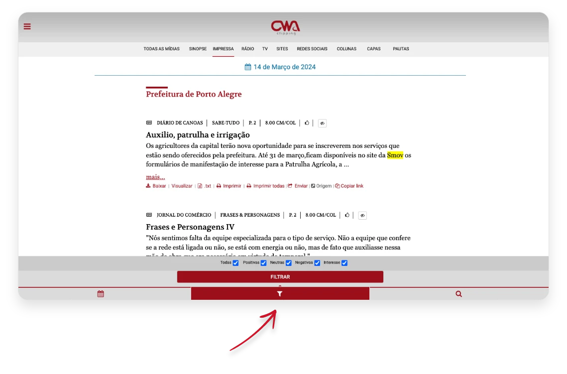 Este recurso no rodapé da página permite que o usuário filtre matérias por sentimento. Por exemplo, se você precisa ver somente aquelas que tiveram um tratamento negativo por parte da mídia, basta marcar o check correspondente.