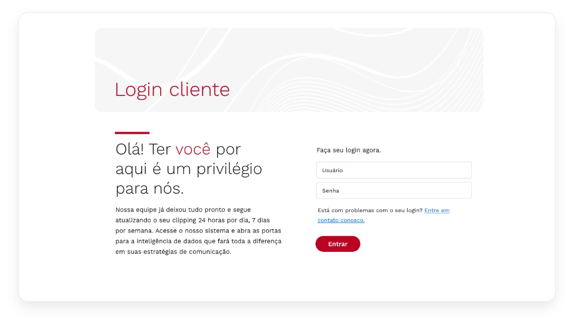 O primeiro passo para você gerenciar as informações do clipping é acessar o portal www.cwaclipping.net/sistema e fazer o login, composto do endereço eletrônico que você utiliza e a senha que você recebeu no seu e-mail.