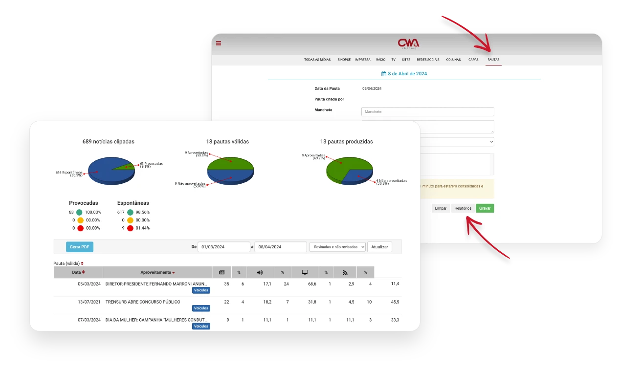 Depois que a pauta é associada à notícia do clipping é possível gerar relatórios de mídia provocada, ou seja, pautas que foram aproveitadas pelos veículos, clicando novamente na aba PAUTAS e em RELATÓRIOS. Também é possível ter acesso aos relatórios pela página principal do usuário administrador.