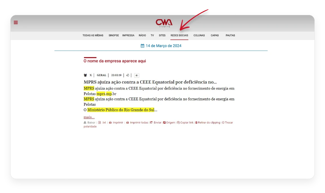 O clipping de TV também tem o recurso de download do arquivo em MP4, além do compartilhamento através do envio de um link.